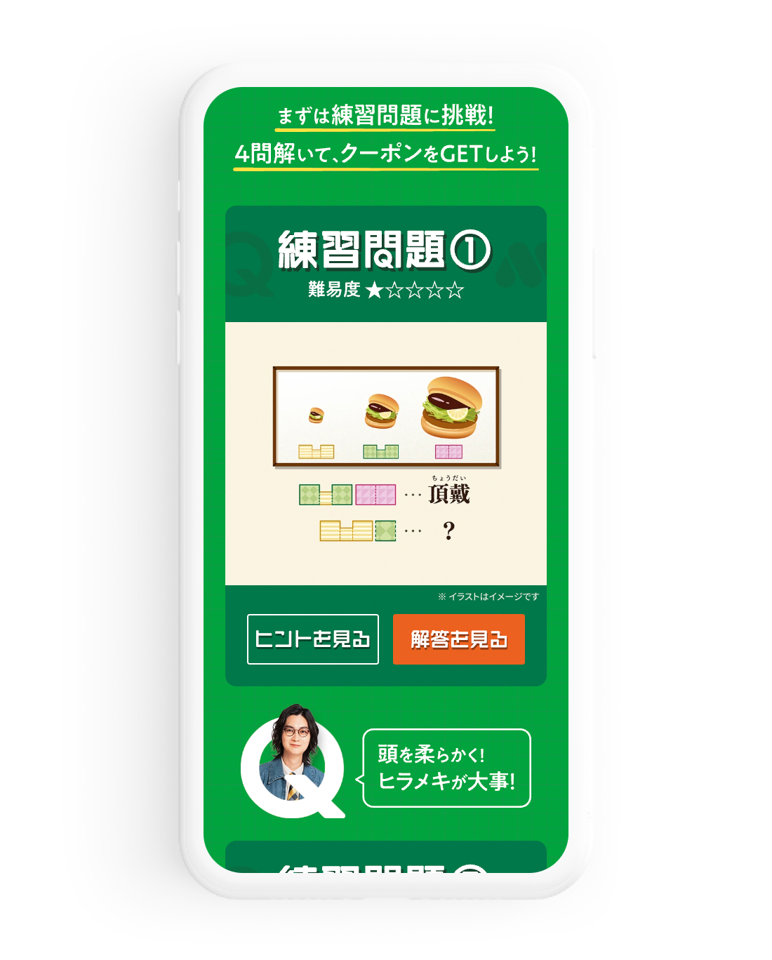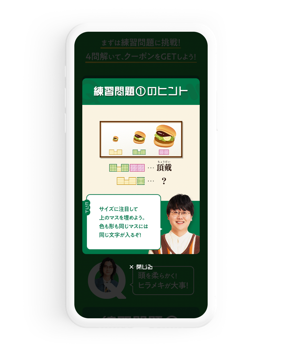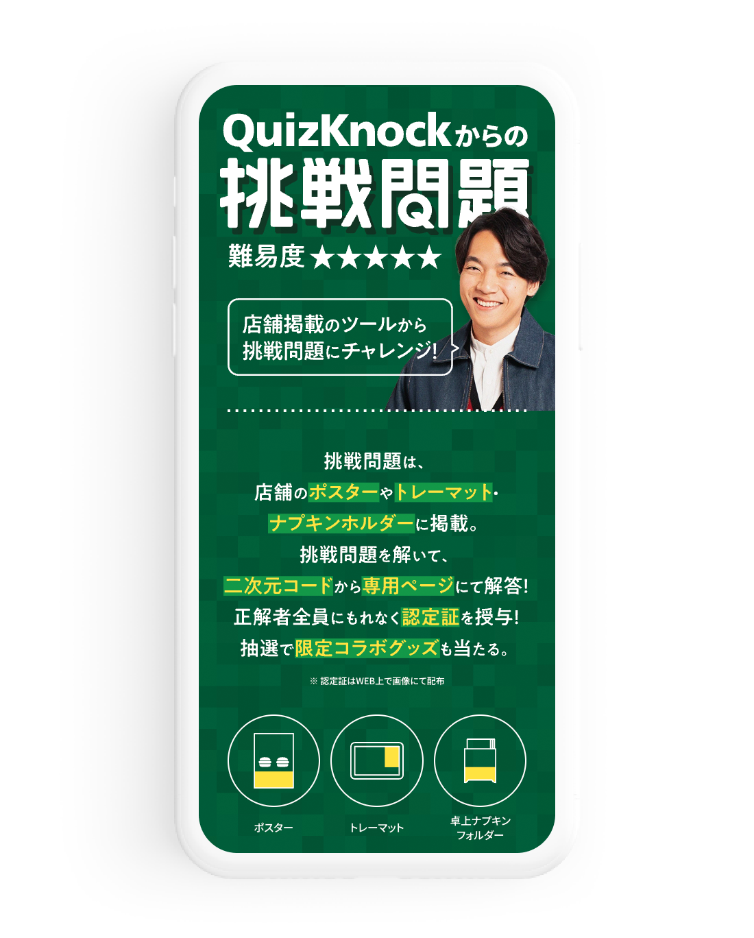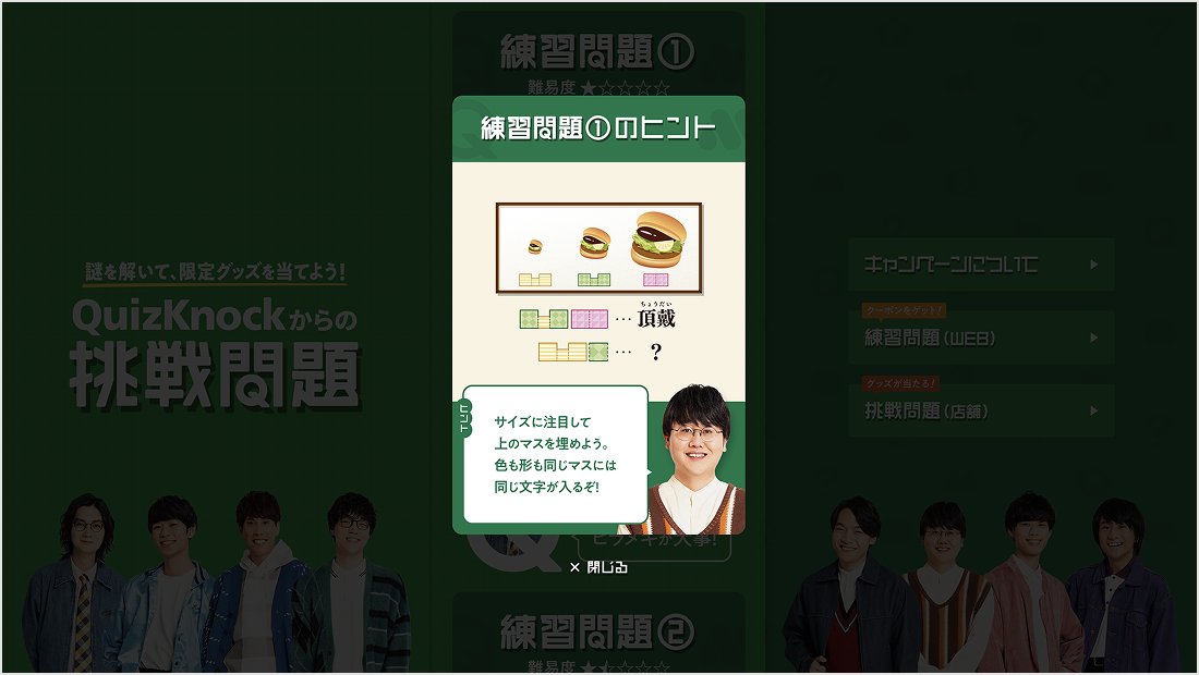 QuizKnockの知的なイメージとモスバーガーの親しみやすさを両立。緑色と黄色を基調とした視認性の高い配色でワクワク感を演出し、思わず解きたくなるクイズコンテンツを主役にした体験設計を行っています。