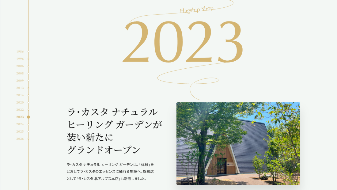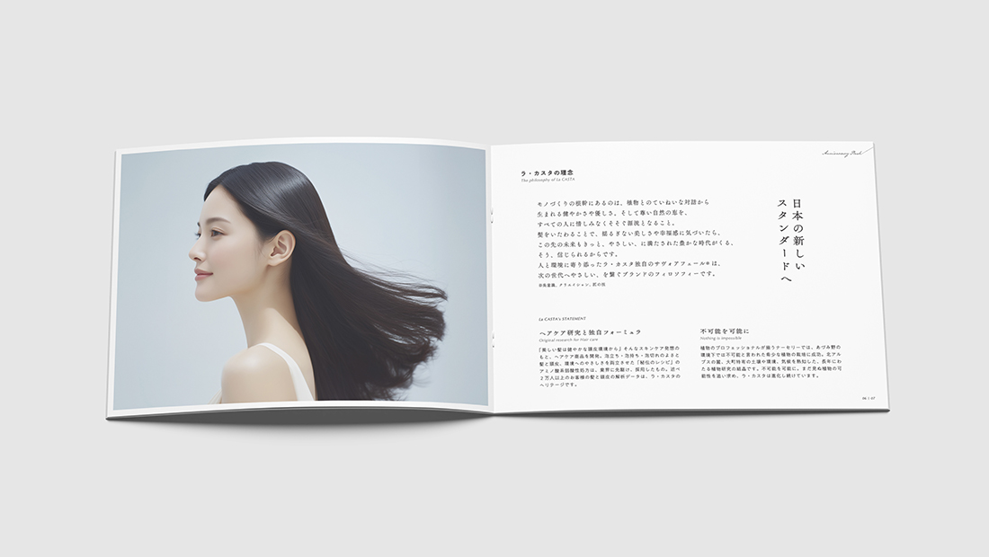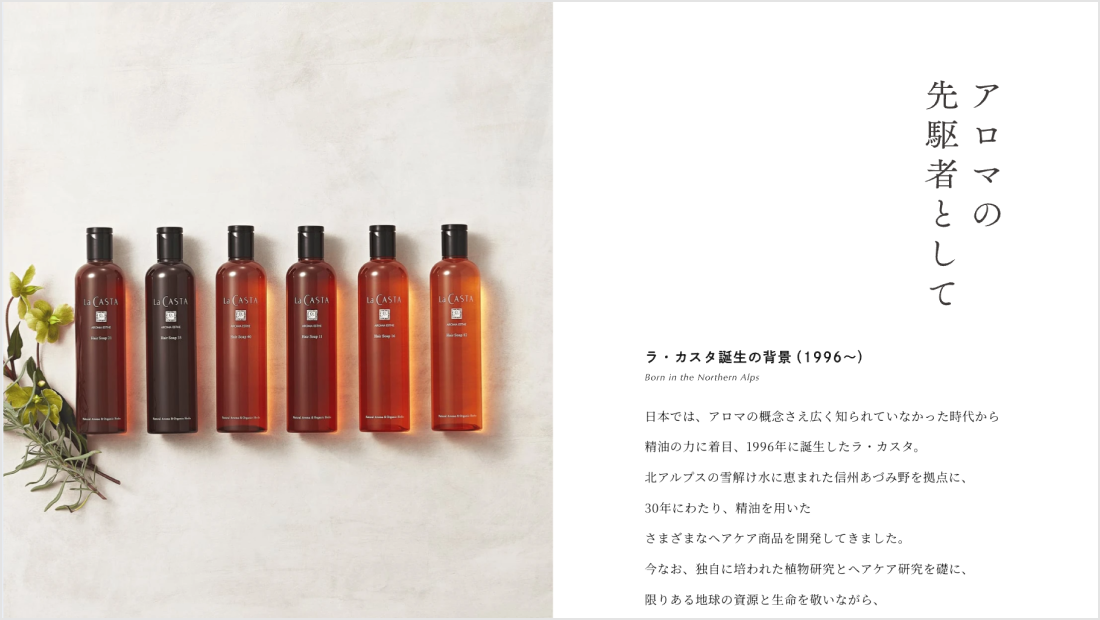ラ・カスタがヘアケアと自然に向き合ってきた歩み(過去)と、更に力を注ぐこと(未来)をメッセージとコンテンツとして発信し、創業者の想い(自然と工場が一体な関係性の場所)と環境に配慮したサスティナブルな企業・ブランドである事を印象付けるキービジュアルを制作しました。